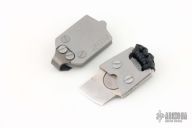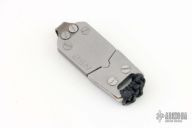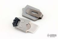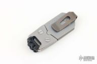 This Atom from Amsler Knives is a small EDC fixed blade with satin finish. The handle has been skeletonized to accept a small magnet for sheath retention. Exposed tang pommel with lanyard hole. The scales and sheath are comprised of stonewashed stainless steel. Titanium deep carry pocket clip is positioned for tip down carry. Some very minor carry marks on frame edge, but overall excellent condition.