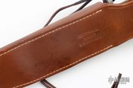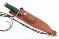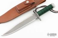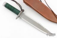 This First Blood knife by Andy Wood features a two tone blade with bead blasted center and satin grinds, serrated top edge and 14 saw-teeth on blade spine, .250" blade stock and 1.478" blade depth, hidden tang construction. The handle has a bead blasted stainless steel double guard with flat and Phillips head screw drivers, hollow cord wrapped handle, and aluminum removable butt cap with an O-ring to make it water-proof. Comes with brown leather sheath that has a honing stone. Has compass in butt cap. Excellent condition. Includes a padded zippered case.