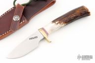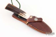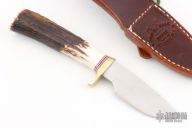 The Model 11 is the original drop point blade. Designed by Tommy Thompson, noted Alaskan guide, in 1952 for big-game skinning, with point dropped below top of blade to prevent cutting too deeply through skins when used point first. The blade is satin finished with a notched thumbrest, .155" blade stock and 1.070" blade depth, hidden tang construction. The handle has a brass guard and butt plate, stag handle, red/white/blue spacers. Comes brown leather sheath with belt loop and original paper wrapping. New condition.