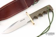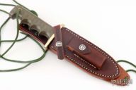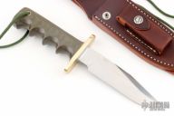This Model 15 Airman by Randall Made Knives features a clip point blade with a sharpened top edge, .211" blade stock. 1.206" blade depth, full tang construction. The handle has green linen micarta handle with finger grips and a brass guard. The Model 15 is designed especially for heavy-duty use and to be as nearly indestructible as possible. Comes with a brown leather sheath and original paper wrapping. New condition.