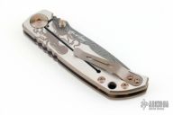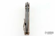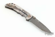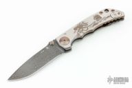 This Harsey framelock folder by Spartan Blades features a Damascus finished drop point blade with dual thumbstuds and a notched thumbrest. The handle has a two-tone anodized titanium frame with a laser engraving a tip up titanium clip and filler tab. Has nice detent, lockup, and blade seating. Excellent condition. Comes with original box.