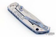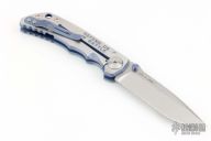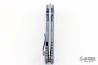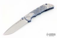This Harsey framelock folder by Spartan Blades features a Damascus finished drop point blade with dual thumbstuds and a notched thumbrest. The handle has a two-tone anodized titanium frame with a laser engraving a tip up titanium clip and filler tab. Has nice detent, lockup, and blade seating. Excellent condition. Comes with original box.
