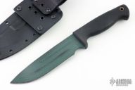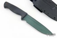 This INFI Dog Soldier 6 by Scrapyard Knives features a green sage coated blade with .215" blade stock and 1.590" blade depth, hidden tang construction with a black rubber handle with lanyard hole. Has kydex sheath with belt loop. Excellent condition.
