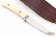 This Hunter by Tommy Lee features a mirror polished blade with .123" blade stock and .699" blade depth, full tapered tang construction. The handle has engraved nickel silver guard, walrus ivory scales with black liners and engraved nickel silver pins. Comes with a brown leather sheath. Has a couple cracks in the scales, otherwise good condition.