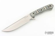 This Urban Grudge from the Busse Custom Shop features a satin finished drop point blade with swedge. 0.226" blade stock and 1.265" blade depth. The handle is comprised of black/tan G10 scales with hollow pins over full tang construction. Exposed tang pommel with lanyard hole. Excellent condition.