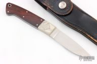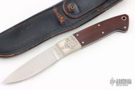 This hunter by WE Ankrom features a hand rub high satin finished blade with .126" blade stock and .864" blade depth, full tapered tang construction. The handle has engraved nickel silver dovetailed bolsters done by G. Sherwood, rosewood scales, nickel silver pins and a lanyard hole. Comes with a black leather sheath, it is not original, but fits nicely. Has a few light scratches, otherwise excellent condition.