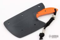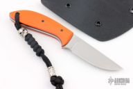 This knife by David Lancaster Clark features a hand rub satin finished blade with .123" blade stock and .837" blade depth, full tang construction. The handle has orange G-10 scales with black liners and pins. Comes with a kydex sheath. New from maker.