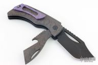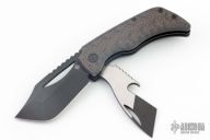 This KTC-2 by Koch Tools features a two-tone blade with notched thumbrest and a thumbhole, this blade is a linerlock. The second blade is a prybar with a bottle opener, this blade is a slipjoint with a half-stop. Has laser engraved titanium scales, black stainless steel center liner, dark tumbled stainless steel spring and backspacer, tip up anodized titanium clip with lanyard hole. Comes with original box and papers. Excellent condition.