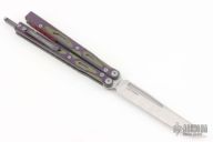 This Balisong by Maxace Knives features a satin finished 14C28N blade with false top edge. The handle has purple/green G-10 scales, titanium liners , red aluminum  spacers, tip up stainless steel clip and T-latch. Comes with original box and trainer blade. New from maker.