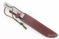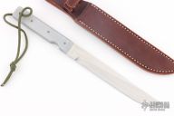 This Model 10-7 by Randall Made Knives features a satin finished blade with .137" blade thickness and .923" blade depth, full tang construction with aluminum scales and brass pins. Notched thumbrest. The Model 10 is an ideal knife for yachtsmen and fisherman as well as for general household uses. Comes with a brown leather sheath and original paper wrapping. Has some scuffs on the handle, otherwise excellent condition.