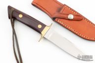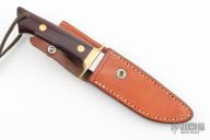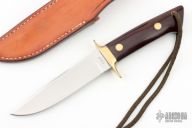 This Fighter by Jimmy Lile features a satin finished blade with .202" blade stock and 1.085" blade depth, full tapered tang construction. The handle has a brass guard and pins with maroon linen micarta scales. Includes a brown leather sheath, but it doesn't quite fit, otherwise excellent condition.