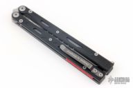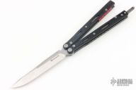 This Balisong by Maxace Knives features a satin finished 14C28N blade with false top edge. The handle has black G-10 scales, titanium liners , red aluminum  spacers, tip up stainless steel clip and T-latch. Comes with original box and trainer blade. New from maker.