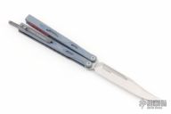 This Balisong by Maxace Knives features a satin finished 14C28N blade with false top edge. The handle has grey G-10 scales, titanium liners , red aluminum  spacers, tip up stainless steel clip and T-latch. Comes with original box and trainer blade. New from maker.