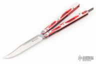 This Balisong by Maxace Knives features a satin finished 14C28N blade with false top edge. The handle has red/white G-10 scales, titanium liners , red aluminum  spacers, tip up stainless steel clip and T-latch. Comes with original box and trainer blade. New from maker.