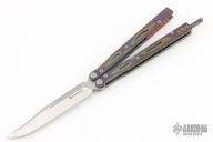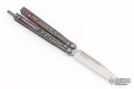 This Balisong by Maxace Knives features a satin finished 14C28N blade with false top edge. The handle has purple/green G-10 scales, titanium liners , red aluminum  spacers, tip up stainless steel clip and T-latch. Comes with original box and trainer blade. New from maker.