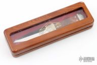 The Koji Fixed Blade Knife features a mirror polished dagger style blade with a full tang construction.  .127" Blade Stock.  .818" Blade Depth.  The handle has sculpted steel bolsters with wood scales.  Includes a wooden display case.  Has a few scratches otherwise the knife is in Excellent Condition.