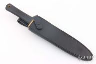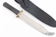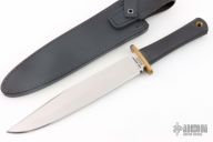 This Trail Master bowie by Cold Steel features a satin finished clip point blade with a false top edge, .299" blade stock and 1.499" blade depth, hidden tang construction. The handle has a brass guard and a rubber handle. Comes with original box and black leather sheath. Excellent condition.