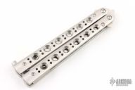 This Model 67 Balisong by Benchmade features a tumble finished tanto recurve blade and stainless handles with T-latch. Nice and tight. Comes with original box, papers and sheath. Excellent condition.