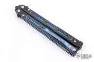 This Model 51 Morpho Balisong from Benchmade has a black finished D2 stainless steel spear point blade. Handle is black G10 with blue jeweled/ anodized titanium liners and blue anodized titanium tip up clip. Comes with original box and papers. Excellent condition.