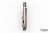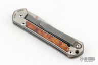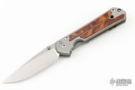 This Small Sebenza 21 by Chris Reeve Knives features a two tone blade with notched thumbrest and single thumbstud. The handle has a two-tone titanium frame with Thuya Burl inlays, matching tip up clip. Comes with original box, sheath and COA dated OCT 25, 2017. Excellent condition.