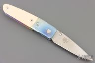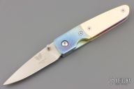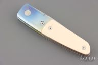 This Mel Pardue design liner lock by Benchmade features a satin finished blade with single thumb stud. Anodized and orange peel finished titanium bolsters with ivory paper micarta scales, anodized titanium liners and a paper micarta backspacer. Strong lock up and nice detent. Excellent condition. Comes with original box and papers.