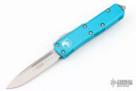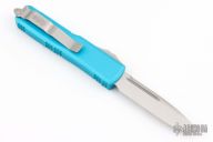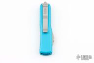 This UTX-85 by Microtech Knives features a satin finished single edged blade with fullers. The handle has a turquoise aluminum frame with blasted stainless steel hardware and tip down clip. Dated 04/2010 and #39835. Comes with original box and papers. Has a couple light scuffs, excellent condition otherwise.