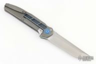 This XV flipper by Reate is a Liong Mah design, it features a stonewash finished blade with a notched thumbrest and flipper. The handle has a stonewashed titanium integral frame, tip up reversible titanium clip with ceramic ball, stainless lockface insert. Rides on bearings, nice detent, lockup and blade seating. Comes with zippered case. Excellent condition.