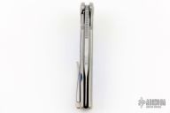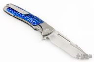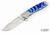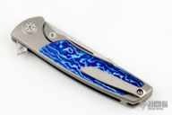 This Mini EVO Flipper from Brian Nadeau features a polished Damasteel blade with a fullers, thumbhole, flipper and notched thumbrest. The handle is comprised of a bead blasted titanium frame with Timascus inlays, satin titanium tip up clip. Rides on bearings, nice detent, lockup and blade seating, stainless lockface insert. Excellent condition. Comes with original box.