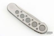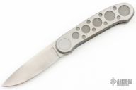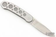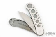 Barry Wood design for Pacific Cutlery. This is a unique scissor opening folder, which when the blade is fully open and locked in place is almost a fixed blade knife. Opening is accomplished by lighting pressing down and outward at the rear indentation on the spine, which releases the locking pin and allows one side of the handle and the blade to rotate down then forward until the blade locks in the forward position. The one side of the handle continues to rotate back until it locks in place. Closing requires the same slight thumb pressure at the indentation to release the locking pin, then the one side of the handle is rotated back and around, catching the blade and aligning both with the other side of the handle in a locked closed position. The handle features a steel construction. Has some scratches, otherwise good condition.