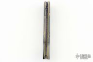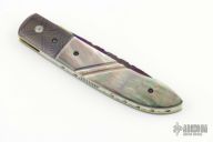 This Linerlock by Peter Martin features a blued multi-bar Mosaic Damascus blade with a single gold thumbstud with diamond inset fileworked blade spine and thumbrest. The handle is comprised of fluted and blued Mosaic Damascus bolsters, fluted black lip pearl scales, anodized titanium liners and a fileworked stainless backspacer. Comes with a leather zippered case. Excellent condition.