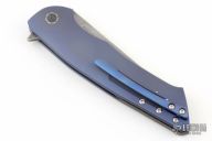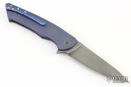 This Mantis Flipper by Herman Knives features a tumbled blade with flipper. The handle has a milled and anodized titanium frame, titanium liner, and tip up anodized titanium clip and backspacer. Nice detent, lockup and blade seating. Rides on bearings. Excellent condition. Comes with original box.  Excellent Condition.