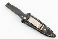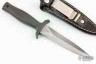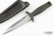 This Mark 1 dagger by Gerber is double-edged and hand rub satin finished, .247" blade stock and .949" blade depth, hidden tang construction. Black coated aluminum handle. Comes with black leather sheath with boot clip. #007377. Has some scratches, has been sharpened, otherwise good condition.