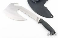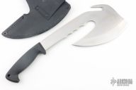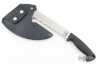 Wicked looking axe designed by Ken Warner and Mike Stewart of Blackjack Knives. Blade is .173" thick and about 7.5" cutting edge, has gut hook on back. 15.75" overall with a rubber handle. Comes with original sheath. Has some light scratches, otherwise excellent condition. Blade Steel: Aus8