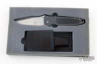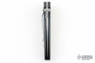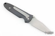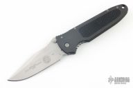 This Janich Tempest linerlock by Masters of Defense has a bead blasted blade with notched thumbrest and dual thumbstuds. Handle is dark aluminum with non-slip inserts and a stainless steel reversible clip. Comes with original box, papers, and belt sheath. Has a few light scuffs, otherwise excellent condition.