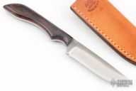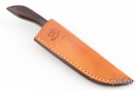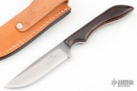 This hunter by Anza Knives features a blade made from a file, dymondwood scales with, .147" blade thickness and .910" blade depth, full tang construction. Comes with a brown leather sheath. Has some light oxidation on the blade, otherwise good condition.