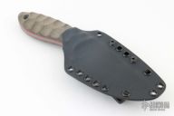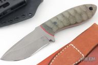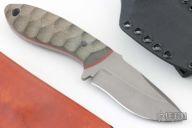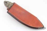 This Recurve by Tom Krein features a stonewashed blade with false top edge, .193" blade thickness and 1.523" blade depth, full tang construction. The handle has green canvas micarta scales with red liners. Comes with a leather sheath and a kydex sheath. Excellent condition.