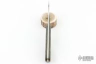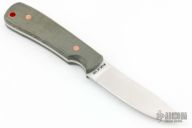 This knife is modeled after a Wayne Goddard knife and made by Mike Vallekamp at Vnives. This knife is the 2024 OKCA Club Knife. It has a satin finished blade with .127" blade stock and .875" blade depth, full tang construction. The handle has green canvas micarta scales with copper pins and escutcheon. The knife is #100 of 105. New from the 2024 OKCA Knife Show.