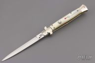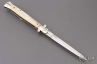 This Picklock auto by Latama features a polished spear point blade with a false top edge. Nickle silver guard and rear bolster and horn scales, brass liners, stainless steel backspacer. Nice function, strong firing and nice blade seating. Excellent condition.