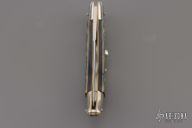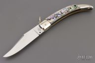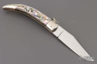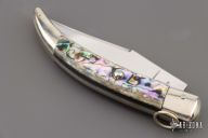 This knife by A.G.A Campolin is a large push button automatic with sliding safety. Polished stainless blade with nickel silver bolsters, abalone scales, brass liners and stainless steel backspacer. Ring Pull unlocking mechanism. Has a few light scratches, otherwise excellent condition.