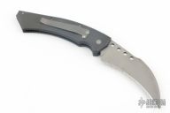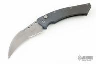 This Hawk Auto from Microtech has a bead blasted hawkbill blade with partial serrations. Handle is black anodized aluminum with bead blasted titanium tip down clip. Action is quick and strong. Dated 9/96. Has some light scuffs and scratches, great condition otherwise.