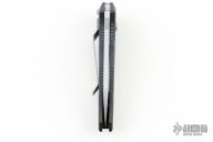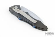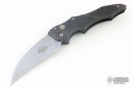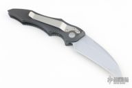 This is an older Kestrel auto from Microtech with a bead blast blade with swedge and notched thumb rest. The handle is comprised of black anodized aluminum with non-slip inserts. Bead blasted tip down clip. Has scuffs and scratches, and gunk in the handle. Good user condition.