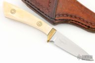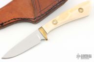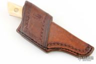 This hunter by Weldon Whitley features a mirror polished drop point blade, .112" blade stock and .806" blade depth, full tang construction. The handle has a brass guard, mammoth ivory scales with black liners. "LM1305" on blade. Comes with a brown leather sheath. Has some light scratches, otherwise good condition.