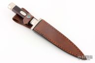 This dagger features a double edged Damascus blade with .213" blade stock and .907" blade depth, hidden tang construction. The handle has a fluted nickel silver guard and butt, ebony wood grip with nickel silver escutcheon. Comes with a brown leather sheath. Has some light scratches, otherwise excellent condition.