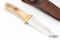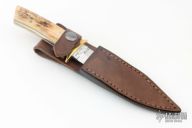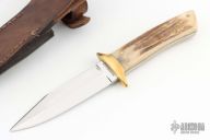 This Chute Knife by RB Johnson features a mirror polished blade with a sharpened top edge, .181" blade stock and .985" blade depth, full tang construction. The handle has a brass guard, stag scales, fileworked brass liners. Comes with a brown leather sheath. Dated 1978 and #4 on the blade. Has a couple light scratches, otherwise excellent condition.