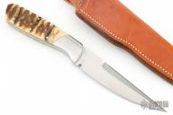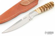 This custom fixed blade by Ron Gaston features a double-edged hand rubbed satin finish blade, full tapered tang construction with .161" blade stock and .989" blade depth. The handle has satin finish stainless steel dovetailed bolsters, sheep horn scales with black liners. Comes with a brown leather sheath. Has a couple light scratches, otherwise excellent condition.