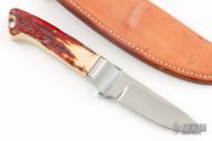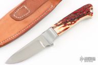 This knife by Lloyd Pendleton features a satin finished blade, .189" blade stock and 1.041" blade depth, full tapered tang construction. The handle has stainless steel bolsters, stag scales, lanyard hole at the butt. Comes with brown leather sheath.  Excellent Condition.