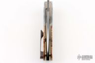 This EXK Plus by Trevor Burger features a hand rub satin finished blade, notched front flipper and thumbrest. The handle features Damasteel bolsters, burl scales, anodized titanium liners, G10 backspacer, and burl scales. Titanium collars, and tip up clip. Excellent condition.