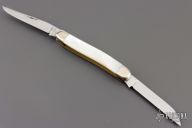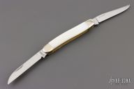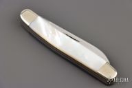 This slipjoint by Colorado USA features mirror polished blades with nail nicks. The handle has nickel silver bolsters, mother of pearl covers, brass liners and stainless steel springs. Has a few light scratches, otherwise excellent condition.