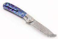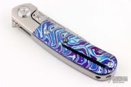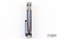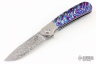 This L1 is a Liong Mah design executed by Reate Knives. It features a Damasteel blade with notched thumbrest, fullers and flipper. The handle has a blasted integral ti bolsters, Mokuti inlays with a matching tip up clip. Comes with original case. Excellent condition.