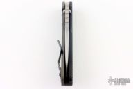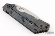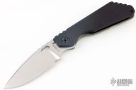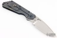 This SMF framelock folder by Mick Strider features a stonewashed spear point blade and a dimple pattern black aluminum and flamed titanium frame and tip up titanium clip. Includes a "Lock Bar Stabilizer" for maximum reverse lock retention. Nice detent, lockup and blade seating. Excellent condition.
